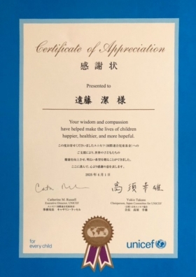 遠藤 潔は、2025年4月1日 公益財団法人日本ユニセフ協会(以下「日本ユニセフ協会」)より会長感謝状を受賞致しました。