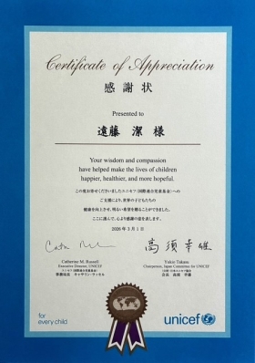 遠藤 潔は、2026年3月1日 公益財団法人日本ユニセフ協会(以下「日本ユニセフ協会」)より会長感謝状を受賞致しました。
