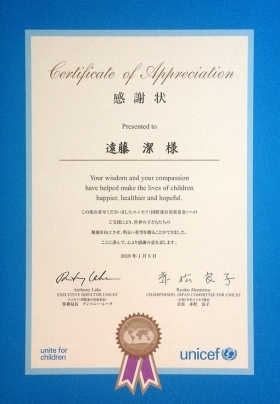 遠藤 潔は、2018年1月5日 公益財団法人日本ユニセフ協会(以下「日本ユニセフ協会」)より会長感謝状を受賞致しました。