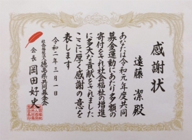 遠藤 潔は、2020年3月1日 社会福祉法人徳島県共同募金会(以下「共同募金会」)より会長感謝状を受賞致しました。