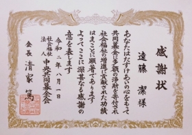 遠藤 潔は、2020年8月1日 社会福祉法人中央共同募金会(以下「中央共同募金会」)より会長感謝状を受賞致しました。