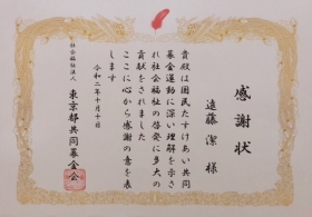 遠藤 潔は、2020年10月10日 社会福祉法人東京都共同募金会(以下「共同募金会」)より感謝状を受賞致しました。