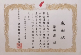 遠藤 潔は、2020年11月25日 社会福祉法人東京都共同募金会(以下「共同募金会」)より感謝状を受賞致しました。