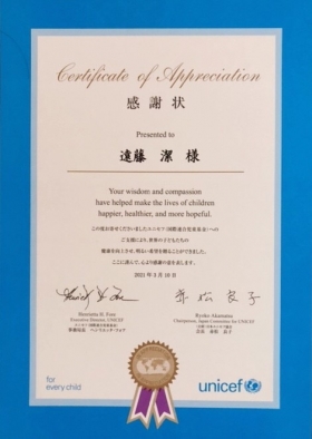 遠藤 潔は、2021年3月10日 公益財団法人日本ユニセフ協会(以下「日本ユニセフ協会」)より会長感謝状を受賞致しました。