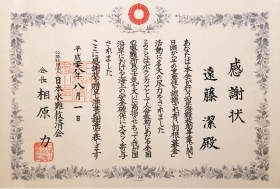 遠藤 潔は、2016年8月1日 公益財団法人日本水難救済会(以下「日本水難救済会」)より会長感謝状を受賞致しました。