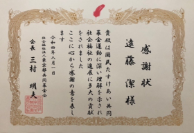 遠藤 潔は、2022年8月1日 社会福祉法人東京都共同募金会(以下「共同募金会」)より会長感謝状を受賞致しました。