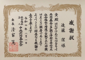 遠藤 潔は、2022年8月1日 社会福祉法人中央共同募金会(以下「中央共同募金会」)より会長感謝状を受賞致しました。