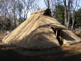 復元された住居跡は、奈良時代のもので、昭和31年(1956年)に東京大学教授、藤島 亥治郎がいじろう博士の設計により建てられた。発掘された住居跡は、地表から約50センチメートルの深さに掘られ、北側に粘土のかまどが築かれてた。柱穴は4か所あり、復元の際には、径約21センチメートルのケヤキ丸太を主柱にし、梁はり・桁けたにスギ丸太を用い、茅かやをふいて復元している。