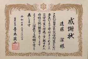 遠藤 潔は、2025年3月26日 東京都目黒区(以下「目黒区」)より目黒区長感謝状を受賞致しました。