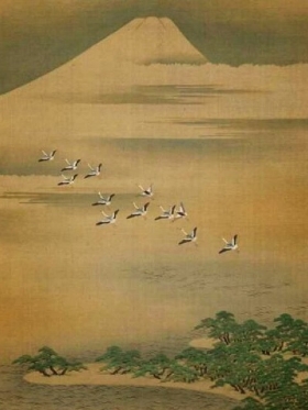 德川将軍から米国大統領へ遣わされた外交的贈答品として、万延元年(1860年)日米修好通商条約批准書交換の使命を託された遣米使節が持参した狩野董川中信筆「富士飛鶴図」がある。遣米使節がサンフランシスコに到着する目前、3月3日(和暦)には開国を推進した大老井伊直弼が桜田門外の変に斃れ、のち幕府の外交政策は転換を余儀なくされる。