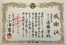 遠藤 潔は、2025年4月18日 大本山増上寺より法主感謝状を受賞致しました。