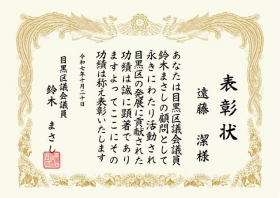 目黒区議会議員より表彰状を受賞