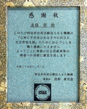 遠藤 潔は、2017年12月1日 特定非営利活動法人RE機構(以下「RE機構」)より理事長感謝状を受賞致しました。