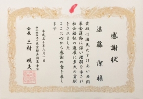 遠藤 潔は、2018年8月1日 社会福祉法人東京都共同募金会(以下共同募金会)より会長感謝状を受賞致しました。