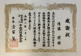 遠藤 潔は、2020年1月1日 社会福祉法人中央共同募金会(以下「中央共同募金会」)より会長感謝状を受賞致しました。