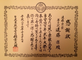 遠藤 潔は、2015年10月17日 日光東照宮より宮司感謝状を受賞致しました。