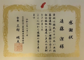 遠藤 潔は、2020年2月1日 社会福祉法人東京都共同募金会(以下「共同募金会」)より会長感謝状を受賞致しました。