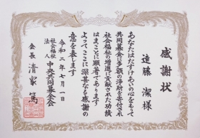 遠藤 潔は、2020年7月1日 社会福祉法人中央共同募金会(以下「中央共同募金会」)より会長感謝状を受賞致しました。
