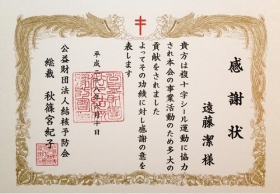 遠藤 潔は、2016年6月10日 公益財団法人結核予防会(以下「結核予防会」)より総裁であられる秋篠宮妃殿下より感謝状を受賞致しました。
