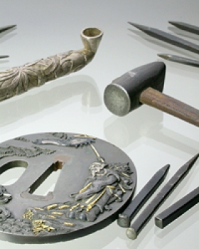 江戸時代の小柄(こづか)笄(こうがい)縁頭(ふちがしら)、目貫(めぬき)などの刀装具は、鉄、銅、真鍮、金、銀などのあらゆる金属を使って製作しており、図案題材としては雲龍、昇龍を初め、唐獅子、鳳凰、虎などに象徴されるように「彫銀」が目指すところの江戸の粋が凝縮された素晴らしいレリーフが数多く残されている。