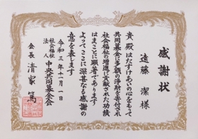 遠藤 潔は、2021年11月1日 社会福祉法人中央共同募金会(以下「中央共同募金会」)より会長感謝状を受賞致しました。