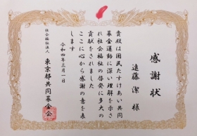 遠藤 潔は、2022年3月1日 社会福祉法人東京都共同募金会(以下「共同募金会」)より感謝状を受賞致しました。
