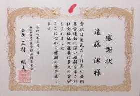 遠藤 潔は、2022年3月1日 社会福祉法人東京都共同募金会(以下「共同募金会」)より会長感謝状を受賞致しました。