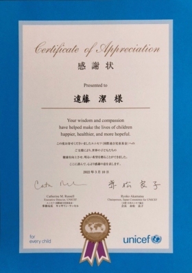 遠藤 潔は、2022年3月10日 公益財団法人日本ユニセフ協会(以下「日本ユニセフ協会」)より会長感謝状を受賞致しました。