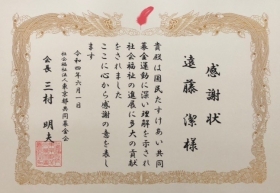 遠藤 潔は、2022年6月1日 社会福祉法人東京都共同募金会(以下「共同募金会」)より会長感謝状を受賞致しました。