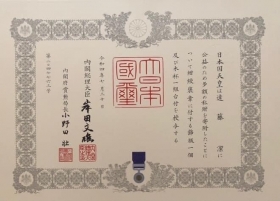 天皇陛下より紺綬褒章飾版並びに賞杯を受章