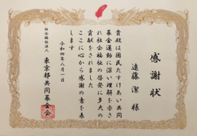 遠藤 潔は、2022年8月1日 社会福祉法人東京都共同募金会(以下「共同募金会」)より感謝状を受賞致しました。