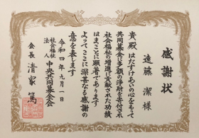 遠藤 潔は、2022年9月1日 社会福祉法人中央共同募金会(以下「中央共同募金会」)より会長感謝状を受賞致しました。