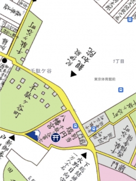 渋谷川の上流一帯は、1644年(正保1年)に「千駄萓村」と明記され、萓が多く自生した水辺であった。「千駄」は、馬に積む荷物(萓)が多いいことを意味している。「千駄ヶ谷」の字が当てられたのは、1688年(元禄元年)以降である。