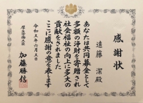 遠藤 潔は、2023年6月5日 社会福祉法人東京都中央共同募金会(以下「共同募金会」)への長期にわたる支援活動により、厚生労働省・厚生労働大臣感謝状を受賞致しました。