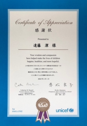 遠藤 潔は、2024年2月1日 公益財団法人日本ユニセフ協会(以下「日本ユニセフ協会」)より会長感謝状を受賞致しました。
